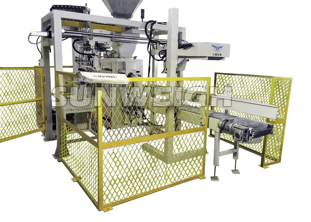 全自動(dòng)閥口袋包裝機(jī)由自動(dòng)袋庫(kù)、上袋機(jī)械手、封口裝置等部分組成,可自動(dòng)完成閥口袋自動(dòng)上袋、自動(dòng)定量灌裝、自動(dòng)移袋輸送、自動(dòng)封口。整個(gè)運(yùn)行過(guò)程只需人工將成摞包裝袋放置自動(dòng)袋庫(kù)上,當(dāng)檢測(cè)到袋庫(kù)內(nèi)包裝袋即將用完時(shí),自動(dòng)報(bào)警提醒現(xiàn)場(chǎng)工作人員補(bǔ)充包裝袋。